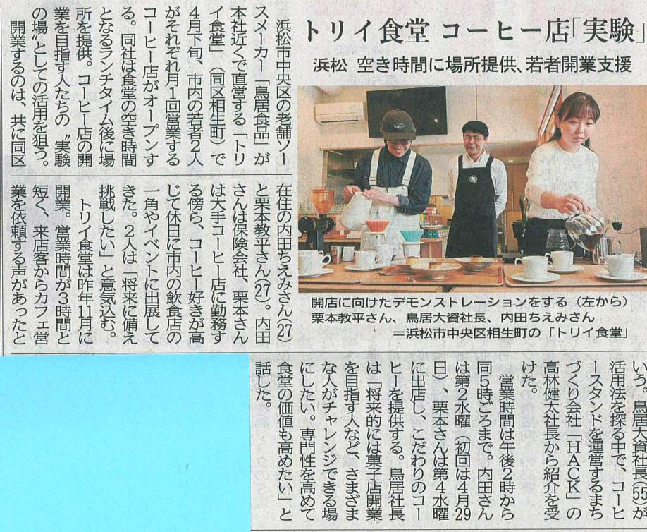 静岡新聞にトリイ食堂にて喫茶店開業の掲載されました 2026/04/28 4月28日(火)静岡新聞 4月29日(水)【トリイ食堂が不定期にて喫茶オープン致します】が掲載されました。 営業時間:14時~17時 食堂ランチタイム後の空き時間に場所を提供し、将来的にコーヒー店の開業を目指す、20代の2人が経験を積む場として活用します。 第2水曜日:Bruna Coffee(内田ちえみさん) 第4水曜日:KYOUHEI COFFEE(栗本教平さん) 御来店お待ちしております🙋