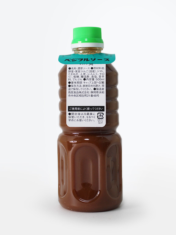 一般のソースはでんぷんでとろみをつけますが、ベジフルソースはすりおろしたりんごでとろみをつけています。すりおろしたりんごでとろみをつけるためにはソース全体の1/4以上の量でりんごを使わないととろみはつきません。